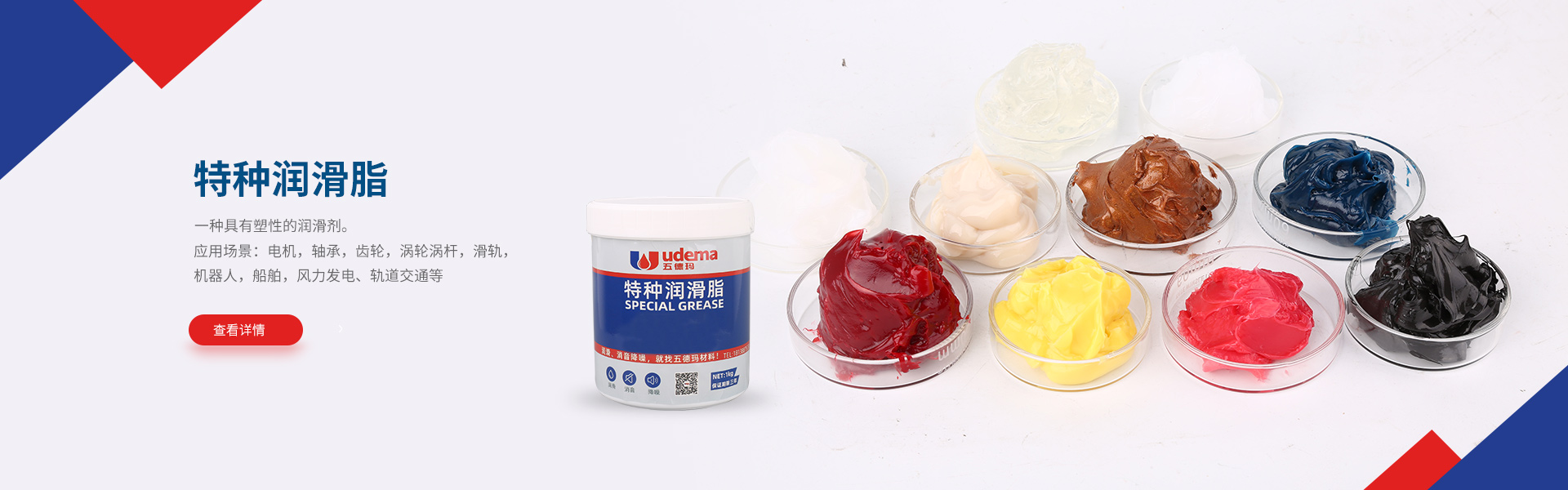 润滑脂是指将稠化剂分散于液体润滑剂中所形成的一种稳定的半固体产品。润滑脂是一种具有塑性的润滑剂。应用场景:电机,轴承,齿轮,涡轮涡杆,滑轨,机器人,船舶,风力发电、轨道交通等。机械系统中只要有摩擦,磨损和腐蚀就会妨碍生产流程,损坏机械。您可以使用优质润滑脂解决这个问题,因为合适的润滑脂能够帮助您确保生产的正常运行以及机器的良好状态。