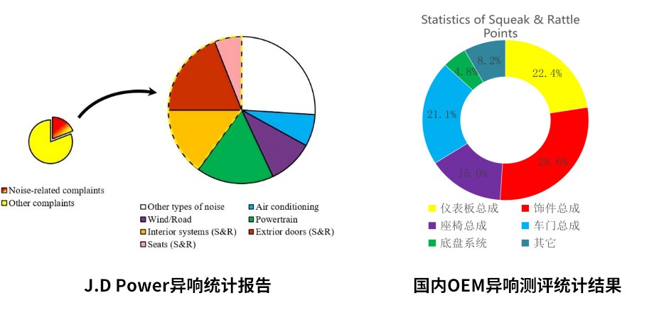 与噪声相关的投诉在所有客户投诉中所占比例(12.1-19.1%),在所有与乘用车噪声相关的投诉中,S&R投诉的构成如左图。以及近3年来的国内汽车OEM公司市场上异响统计,Top3异响为:仪表板总成、座椅、饰件总成。